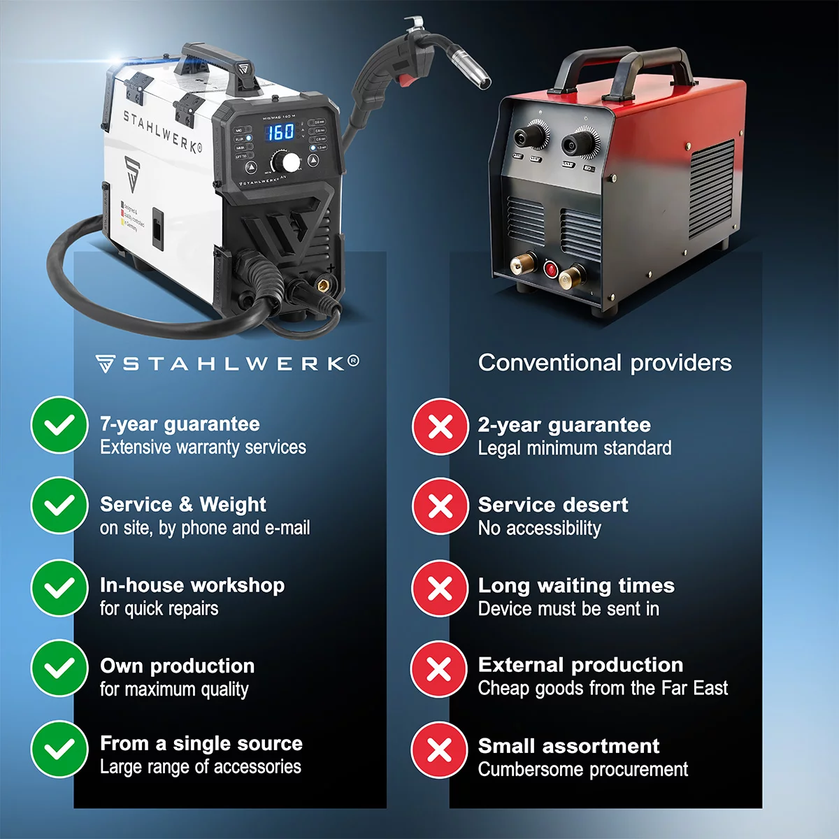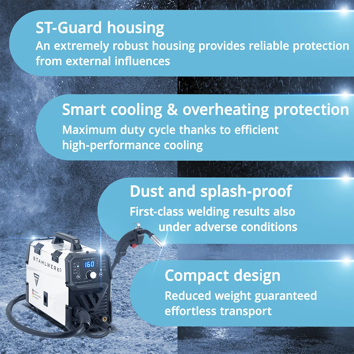 STAHLWERK MIG/MAG-160 M este un invertor compact și versatil pentru oricine caută un aparat de sudură cu sârmă ușor, dar complet echipat, cu funcții suplimentare. Cu o greutate de doar 6,8 kg și un interval de curent de sudare de 20-160 A, dispozitivul acoperă sudarea cu arc cu gaz protector MIG/MAG, sudarea cu sârmă cu miez FLUX, MMA/E-Hand și DC-Lift-TIG - toate de la o priză standard de 230 V. Tehnologia IGBT modernă asigură un arc stabil, eficiență ridicată și performanțe robuste în utilizarea zilnică. În modul MIG/MAG și FLUX, MIG/MAG-160 M procesează sârme cu diametre standard de 0,6 / 0,8 / 1,0 mm și 0,9 mm (sârmă cu miez). Aici pot fi procesate bobine standard de sârmă de 1 kg. Viteza sârmei se ajustează automat la curentul de sudare setat, rezultând o penetrare uniformă cu un control stabil al arcului. Polaritatea dispozitivului poate fi inversată cu ușurință pentru sudarea cu sârmă cu miez de flux fără gaz. Pe lângă sudarea cu sârmă, dispozitivul este capabil și de sudură manuală clasică MMA/E cu electrozi înveliți în straturi. Hotstart facilitează aprinderea, iar funcția antiaderentă reduce curentul în caz de scurtcircuit, astfel încât electrodul să nu se recoacă și să poată fi detașat mai ușor de piesa de lucru. În combinație cu o torță TIG cu ridicare opțională WP-17V, MIG/MAG-160 M poate fi utilizat și ca dispozitiv TIG DC cu aprindere prin contact - ideal pentru îmbinări mai fine și mai curate pe oțel și oțel inoxidabil. Funcționează prin intermediul unui panou frontal transparent cu afișaj digital, selectarea procesului de sudare și a diametrului sârmei. Protecția integrată la supraîncălzire cu LED de control și răcirea inteligentă cu ventilator puternic protejează componentele electronice și permit un ciclu de funcționare practic de până la 60% la 80 A și 100% la 62 A (la o temperatură ambiantă de 40 °C). Carcasa robustă ST-Guard face dispozitivul rezistent la utilizarea zilnică în atelier și la transport.